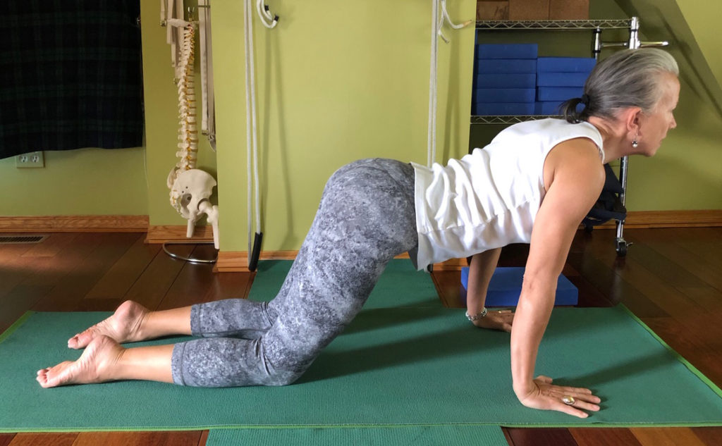 Get on all fours, hands under shoulders, knees under hips. As you inhale, arch your back by lifting your tailbone and gazing upward (that’s Cow). As you exhale, round your back, tuck your chin, and draw your belly in (that’s Cat). Go back and forth slowly, moving with your breath.