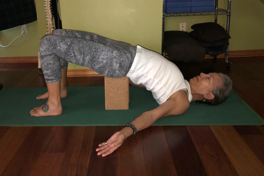 Lie on your back, bend your knees, and place your feet hip-width apart with your arms by your sides. Press into your feet to lift your hips toward the sky. You can clasp your hands under your back or place a block under your hips for support.