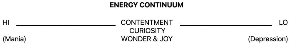 To simplify, an overriding desire to achieve can drive me to accomplish goals. However, impulse also distracts me from intuitive wisdom wherein contentment, wonder, and joy reside. Furthermore, the effect of a “strive and drive” modus operandi is energetically measured by times of high and low energy: a bipolar rhythm when in its extreme. When I consider the continuum depicted below, the middle way, from my own experience, is where the richest life exists.