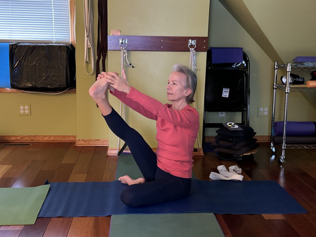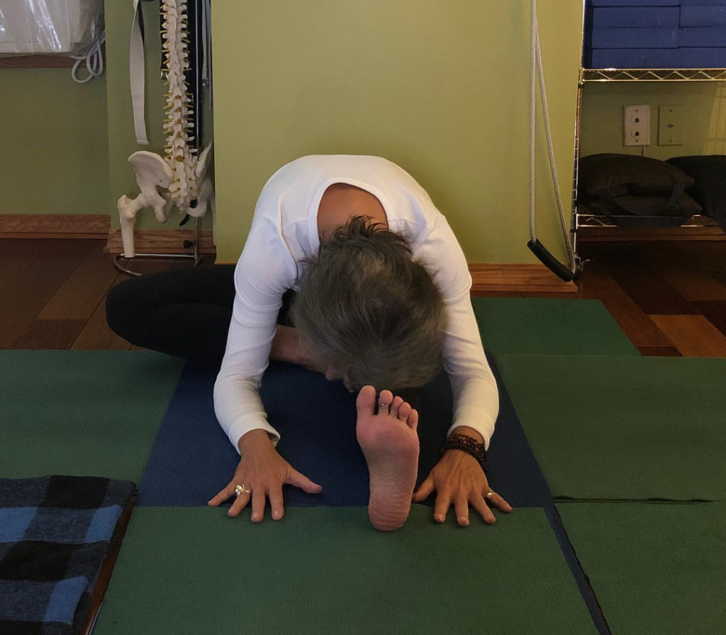 Over the past several weeks, I shared Yoga Actions focused on creating space in the major spinal joints — sacrum-tailbone, lumbar-sacrum, thoracic-lumbar, and C7-thoracic. Using your awareness and breath to expand the space between these spinal vertebrae brings greater ease and joy into your yoga practice. The restorative sequence below provides the opportunity to let go of tension, striving, and/or inertia through practicing subtle rather than gross body actions.